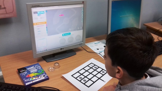 http://ozoblockly.pl/ Tu układamy bloczki, podobnie jak w Scratchu. Następnie wczytujemy kod do robota poprzez wygenerowanie przez komputer ciągu sygnałów świetlnych i odczytanie przez czujniki Ozobota. Wystarczy przyłożyć robota do monitora komputera. Nie zawsze udawało nam się poprawnie wczytać program do robota. Realizowalismy zadanie 1 z ogólnopolskiego rogramu